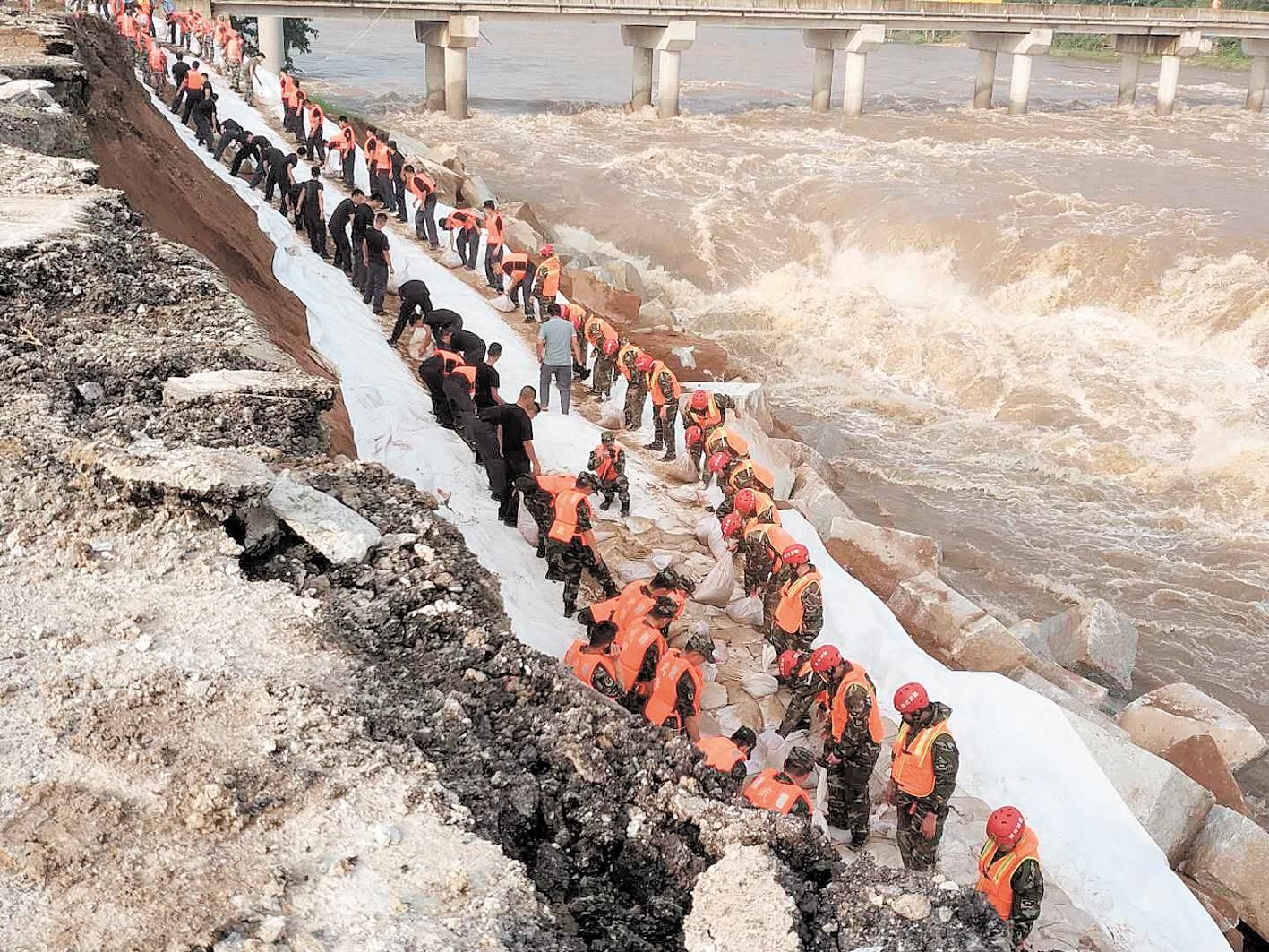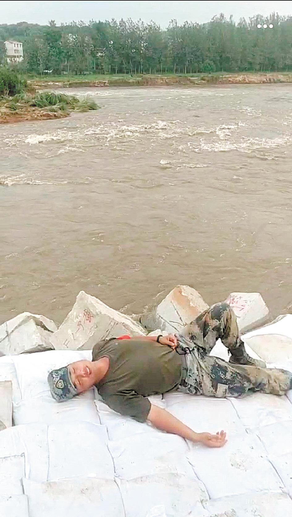 7月19日下午,战士们赶到现场后立即投入抢险工作中(左图)。 抢险间隙,疲劳的战士在河堤上一躺下就睡着了(右图)。 (湖北日报全媒记者 陈鹏 摄)