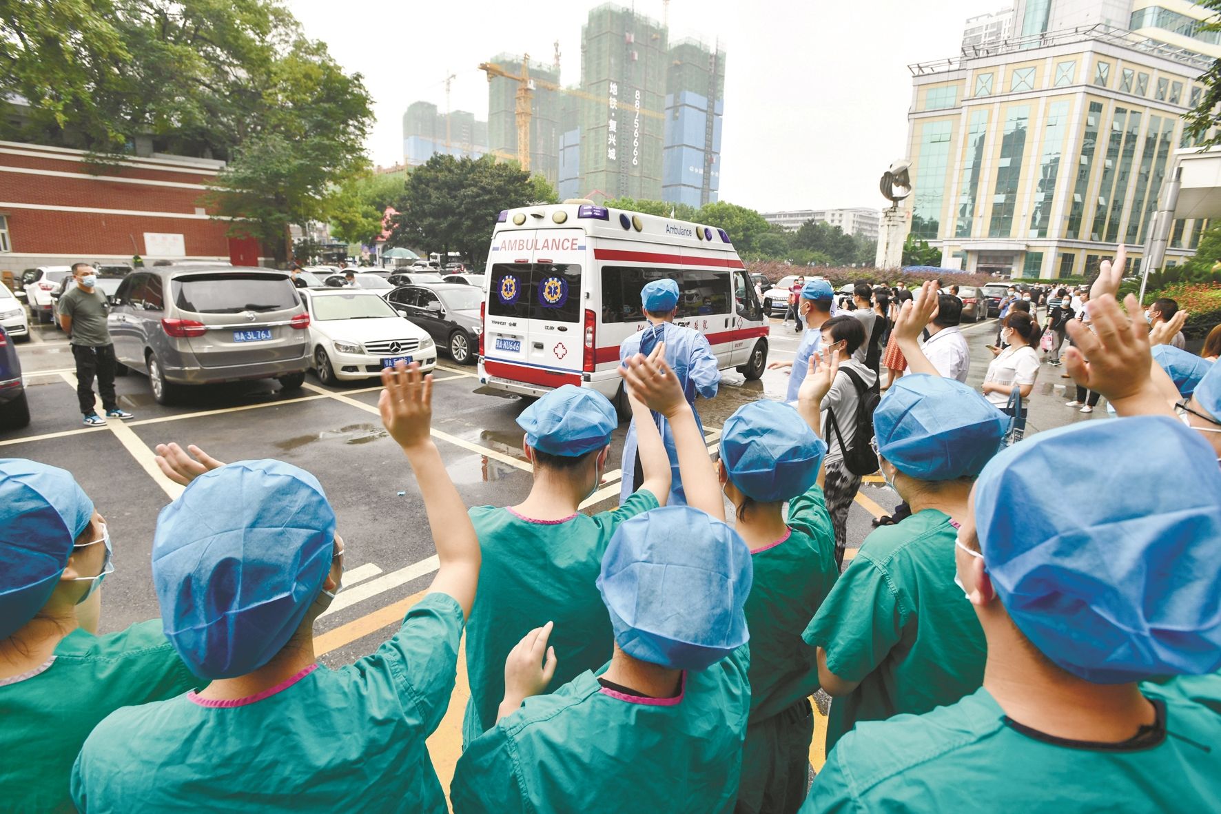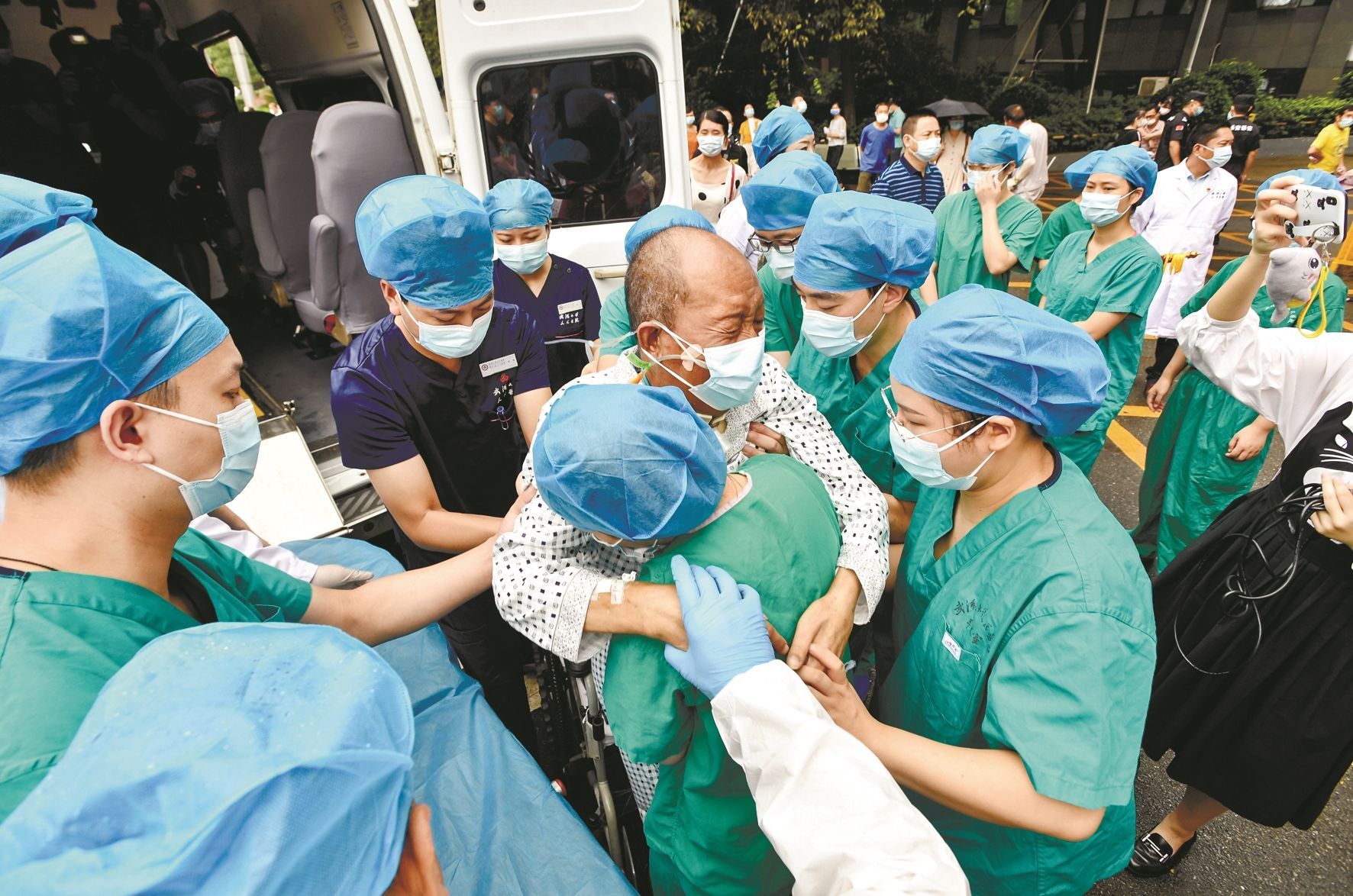7月21日,医护人员为崔志强举行了简短热烈的欢送出院仪式,庆祝他重生。