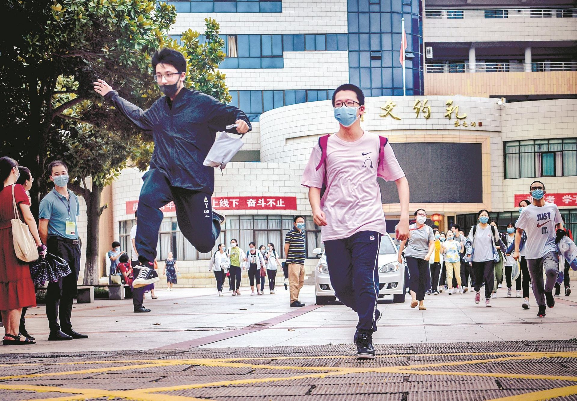昨日下午4时30分,武汉市2020年中考结束。在武汉市第十四中学,同学们笑容灿烂,步伐轻快,有的连走带跑,有的大喊“考完啦”“胜利啦”,气氛十分欢乐。楚天都市报记者刘中灿摄