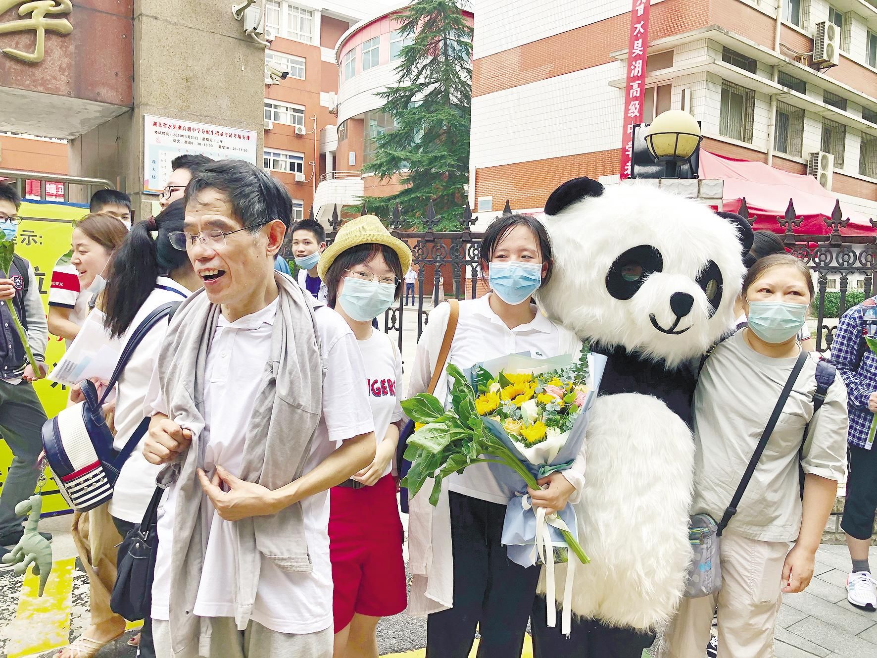 “我的妈妈太神了,太让我惊喜了。”昨日下午4时半,从水果湖中学考点出来的杜度辰,没想到迎来一个大大的惊喜——她的妈妈正穿着玩偶服,扮成国宝熊猫迎接她。