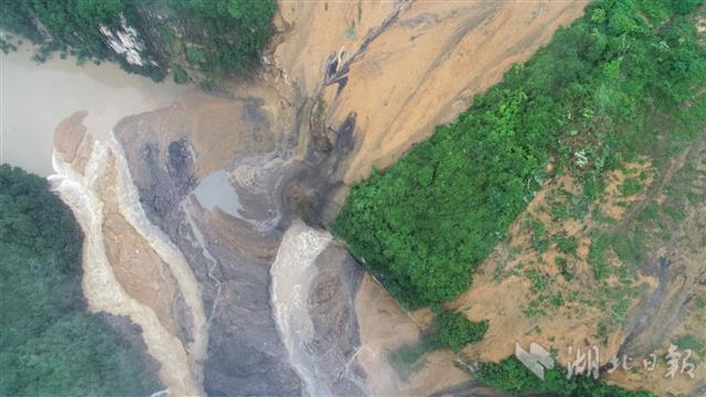 7月21日,清江流经的恩施市屯堡乡马者村沙子坝滑坡体出现大面积滑移。上游来水冲开马者村沙子坝滑坡体堆积的堰塞湖顶,缓解了堰塞湖可能瞬间溃坝的危险。(湖北日报全媒记者 蔡俊 摄)