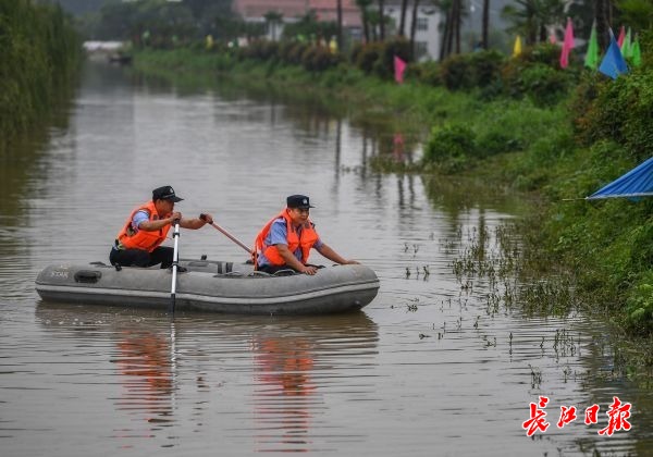 7月21日,卫东和同事在府澴河堤上查看水情。