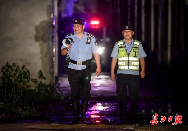 今年汛期以来,环绕南湖村的府澴河、朱家河、新河水位持续上涨。7月10日,由于朱家河水位超过保证水位,政府组织将南湖村的13000余名居民集中转移。卫东和同事一起,拿着小喇叭在村内进行引导,维持秩序。居民转移后,卫东将辅警、安保志愿者分成几个小组,负责24小时在南湖村的5个出入口值守和村内巡逻执勤,保障居民财产安全。军人出身的卫东,家在黄陂,他说,以前当兵保卫国家,现在是名警察,守卫家园是尽职。
