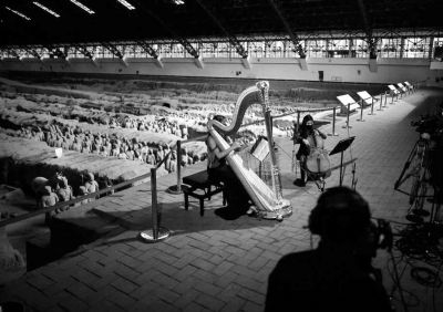 牛背梁最近阴雨连连,乐团必须带上雨布和雨衣;华山陡峭,得用缆车运送乐器,山顶大风吹得乐谱乱飞,平时在户外固定谱子的磁条抵挡不住,只能改成橡皮筋这种“土方法”;在秦始皇陵和其他博物馆里演出,灯光必须调试到国家规定的范围内,声音也不能超过游客最多时的嘈杂程度,选用的乐器都是柔和的弦乐和木管……