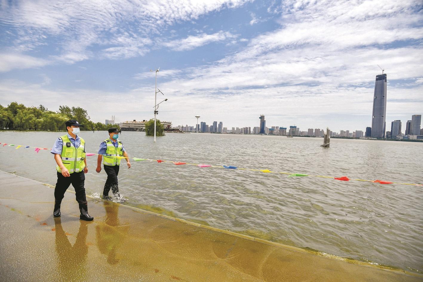 7月22日中午,公安民警沿江堤巡查野泳者