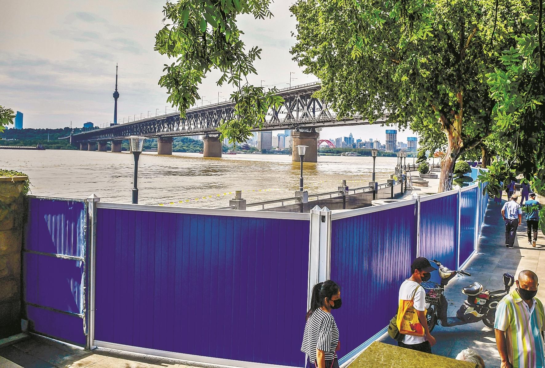 最近几天来,在武昌桥头堡等区域,防汛部门在靠近江边的栏杆上,又增设了一道挡板,防止市民从这里下水,一旁的台阶上,也增加了铁丝网,值守人员说,安全第一,请大家暂时克制戏水的热情。