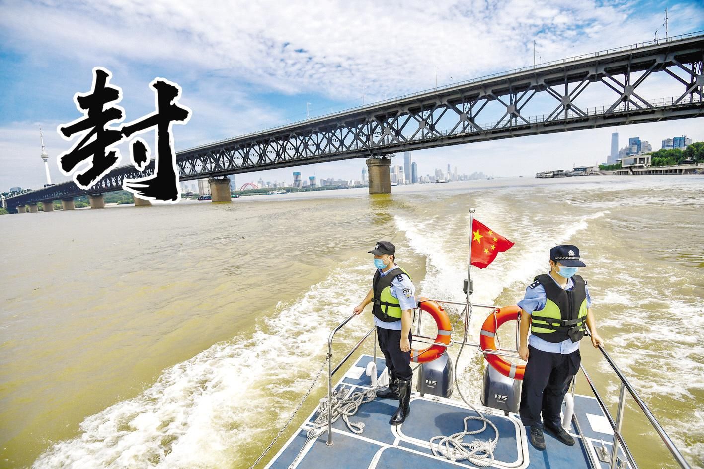 7月22日上午,水上公安民警在长江仔细巡查,提醒市民不要下江游泳