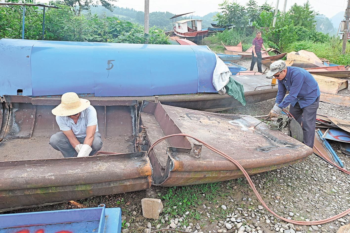 7月22日,在宜都市高坝洲镇青林寺村天峡渔业码头,工人正在集中拆解一批铁质“三无渔船”。自禁捕工作启动以来,宜都市相关部门联合发力,排查清理沿江沿河“三无船只”,依法打击非法捕捞行为,全力推动禁捕工作落实。截至目前,宜都吊装上岸“三无渔船”1227只,查处违法案件14起,8人被采取刑事强制措施。 (湖北日报全媒记者 刘曙松 通讯员 朱灿义 摄)