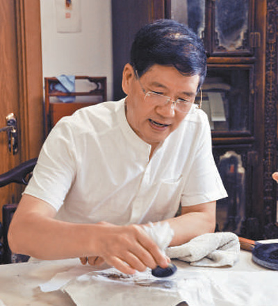 陈旭(见图)的眉头渗满了汗珠,眼睛专注地盯着眼前被润湿的宣纸,用拓包小心翼翼地扑打纸面……纸面“包”在一块见证嵩山变迁的古石上,扑打之下,石头的表面渐渐出现在纸上。一点一点,石头的轮廓越来越清晰;一圈一圈,古石的纹路也印刻在了纸上;一次一次,纸上的层次越来越丰富,高光、阴影部分也一目了然。
