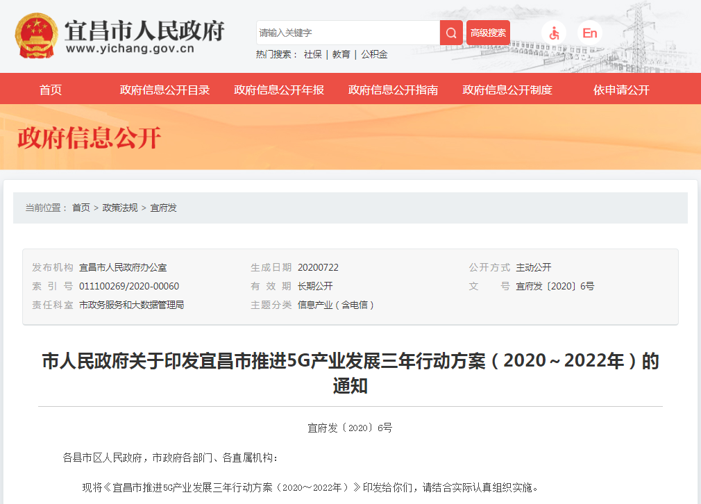 7月22日宜昌发布《宜昌市推进5G产业发展三年行动方案(2020~2022年)》