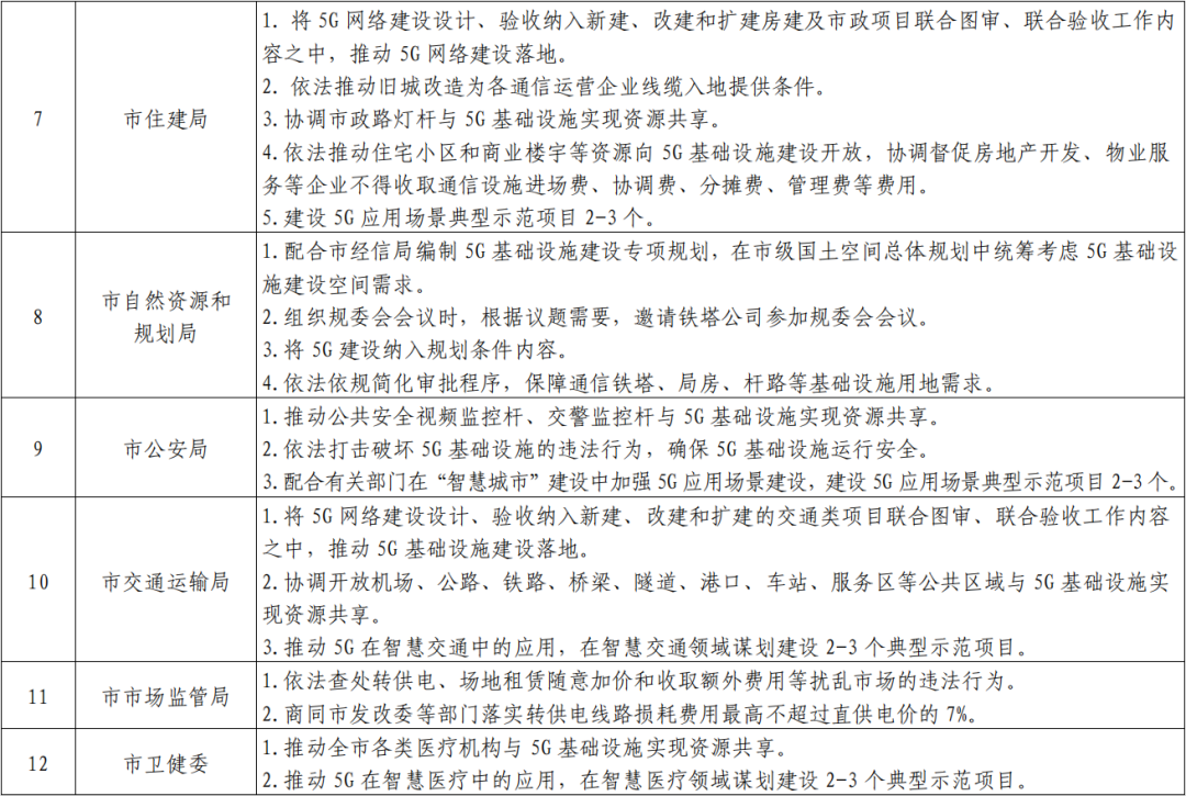 4.将5G建设纳入新建重大项目同步规划、同步建设、同步验收,同步投入使用。相关部门将5G通信设施纳入城区改造、新建交通干线、重要交通枢纽、重点园区、重点景区、重要项目、重点公共文体场馆中,同步开展5G基站、机房及相关配套设施规划,与项目实现基站、通信机房、传输管线同步建设、同步验收、同步投入使用。