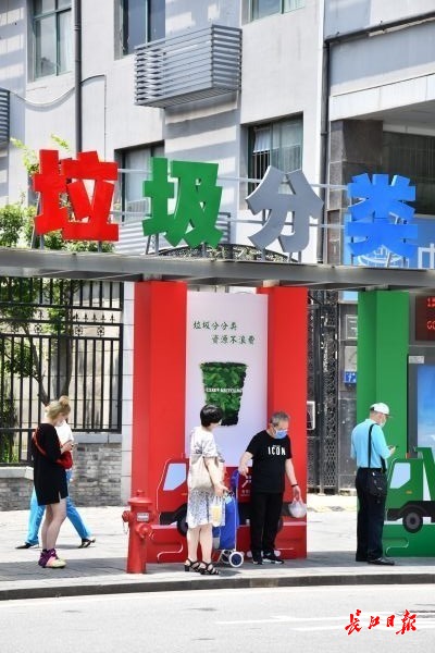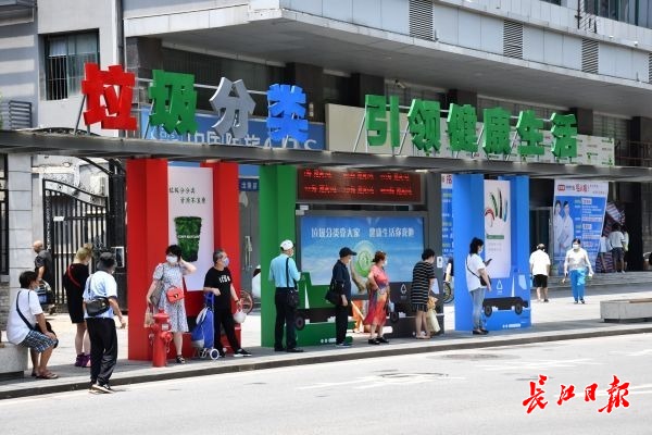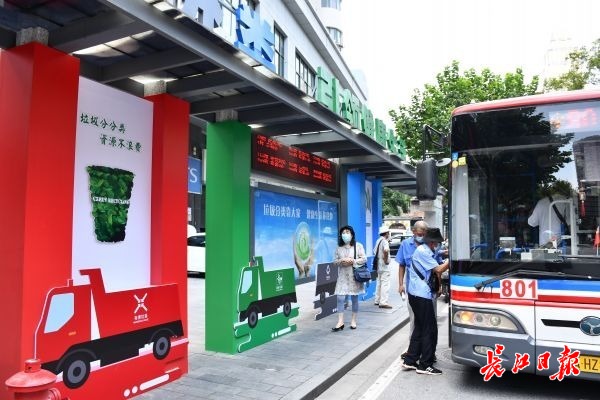 长江日报-长江网7月23日讯 7月23日,长江日报-长江网记者在汉口胜利街一元路公交车站看到,车站装饰主题是“垃圾分类”,涵盖可回收垃圾、厨余垃圾等,让市民在等公交的同时了解垃圾分类的目的与重要性。