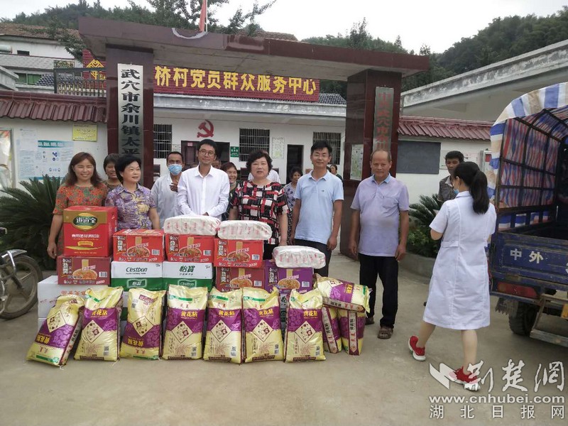 图为:市政协委员、坤悦科技总经理张火龙为余川镇太平桥村安置点受灾群众捐赠物资 。通讯员 余亚峰 摄