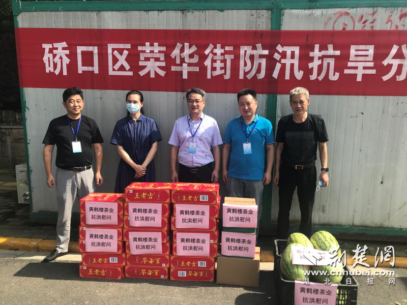 荆楚网客户端一荆楚网消息(通讯员丁元清、覃涌杰)7月22日,正值大暑时节,在硚口区清远巷闸口,硚口区人大代表张岳峰等代表汉口茶市向荣华街一线的防汛工作人员送去了一批爱心物资,包括花露水、风油精、蚊香、凉茶、西瓜等防汛人员急需的物资。