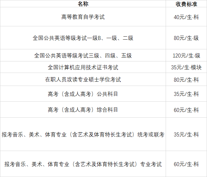 黄石市考试考务费收费标准清单