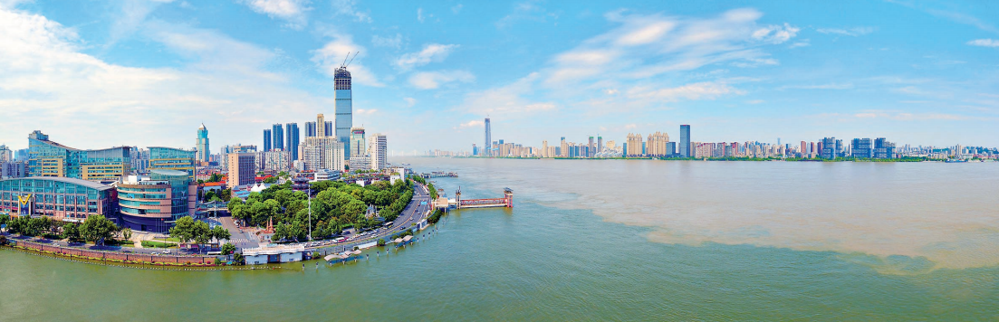 7月22日下午,龙王庙江段,深青色的汉江水与浑黄的长江水形成一道清晰的交汇分界线。