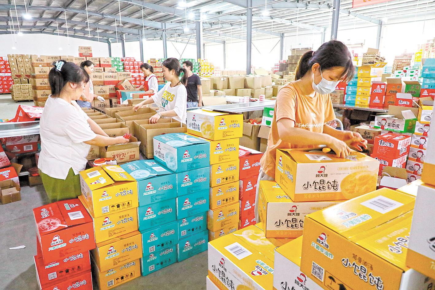 在“顾大嫂”的电商仓库,工人站在传送带前,双手飞速分拣。一箱箱新鲜出炉的产品,贴上快递单,装进物流货车,发往全国各地。