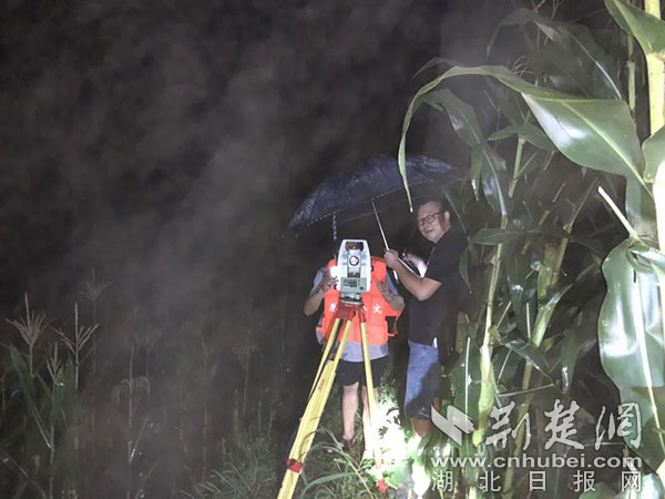 在马者村沙子坝堰塞湖堰体,信息组迅速安装遥测水位计、架设信号线、连接水位传感器,确保相关水位数据定时传送到恩施水情分中心;勘测组想方设法通过RTK、水准点高程引测等方法确定堰体所处高程,进行相关分析计算。21日11时,临时设立的马者水位站(堰体处)建成并投入使用。为了确定马者站水位高程,4名应急监测队员历时9小时圆满完成了长途水准引测。