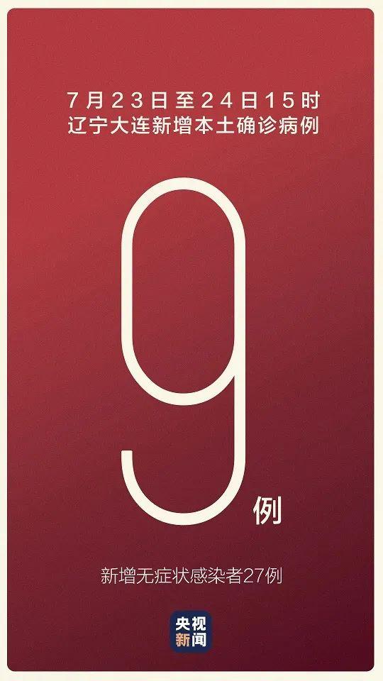 7月23日至7月24日15时,大连新增9例本土确诊病例,27例无症状感染者。