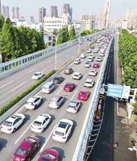 23日早高峰,发展大道二七路上桥匝道高架桥上车辆排起长队。