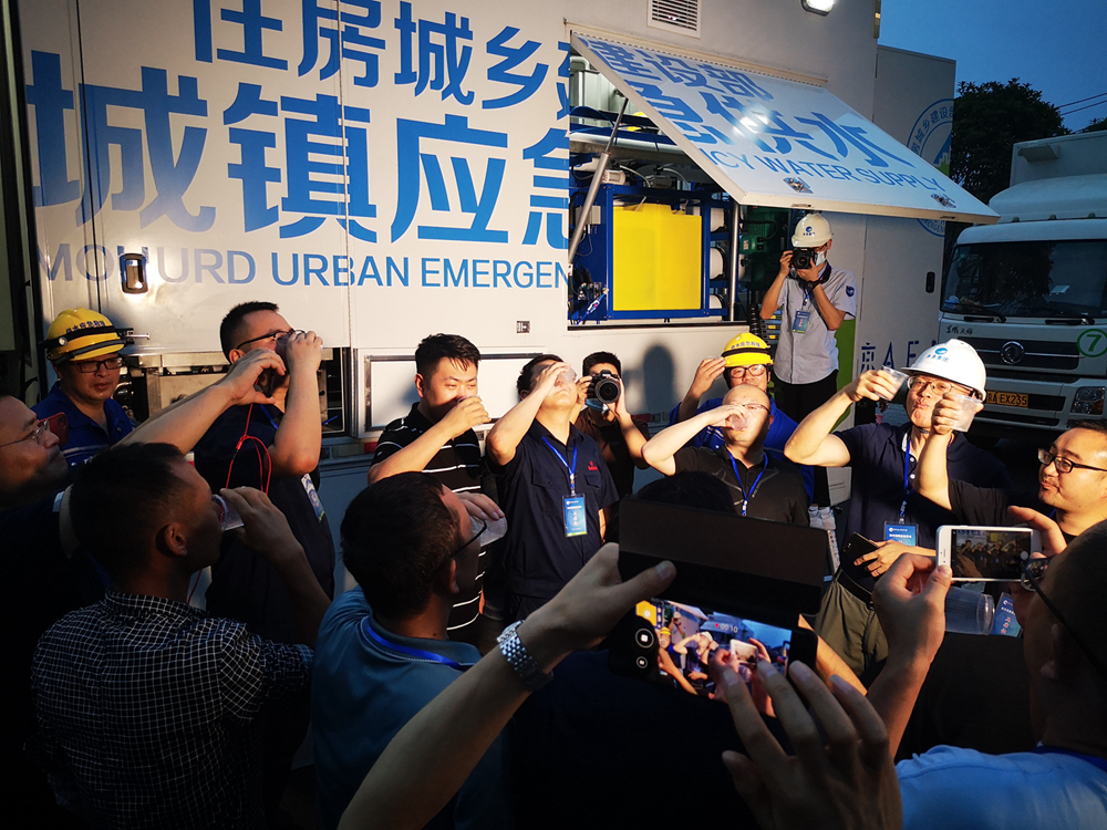 ▲ 7月22日19时30分,应急供水车制水成功,供水人同饮“生命水”
