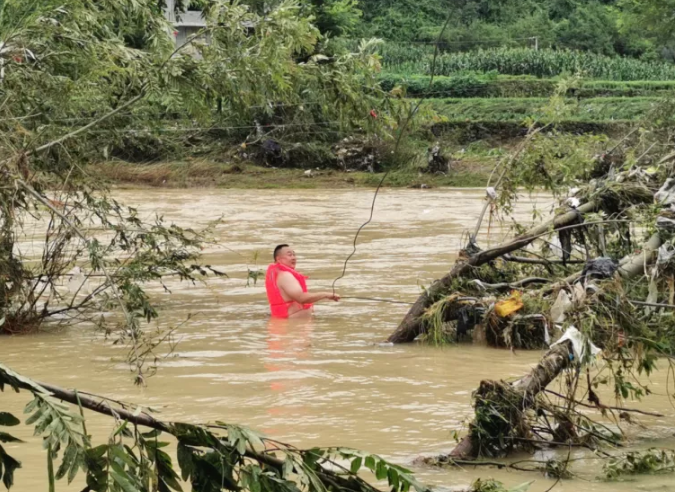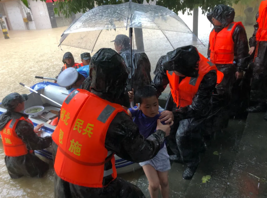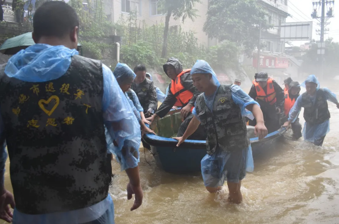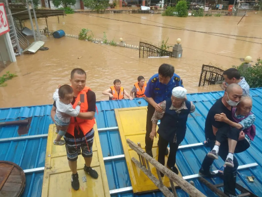 ▲巴公溪路段被汹涌的洪水淹没,被困群众正在接受转移这是团结一心的力量来自武汉、宜昌等7个兄弟县市倾情支援
