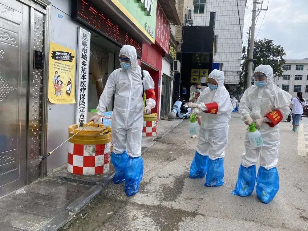 ▲恩施州中心医院“灾后重建”巾帼突击队前往机场路、胜利街社区开展灾后消杀工作