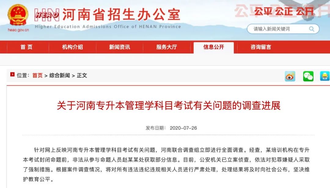 今天(26日)下午,河南省招生办公室发布《关于河南专升本管理学科目考试有关问题的调查进展》: