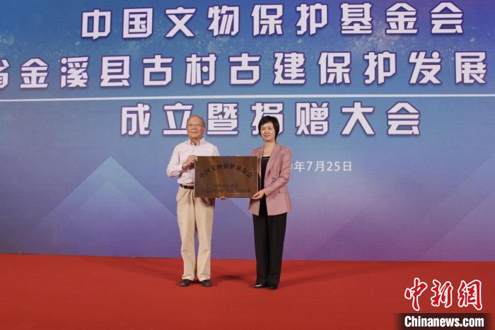 成立大会上,中国文物保护基金会理事长励小捷向中国文物保护基金会江西省金溪县古村古建保护发展专项基金正式授牌成立,金溪县委书记高连珠接受牌匾。
