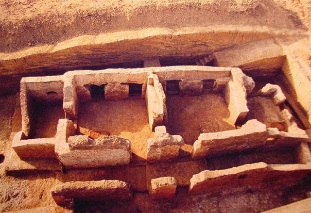在110多万平方米的远古人类特大聚落群中央,雄踞着一座占地22万多平方米的古城。城内一处建有围墙的400多平方米院落中,带走廊的“四室一厅”宽敞明亮,高出地面2米多的墙壁上门窗布局合理。各室内火塘中柴薪灰烬尚存,插在墙上火种“插座”中的火种,似乎仍然燃烧着猎猎火焰……