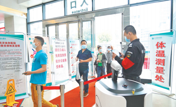 患者排队通过体温监测后进入协和医院门诊就诊。