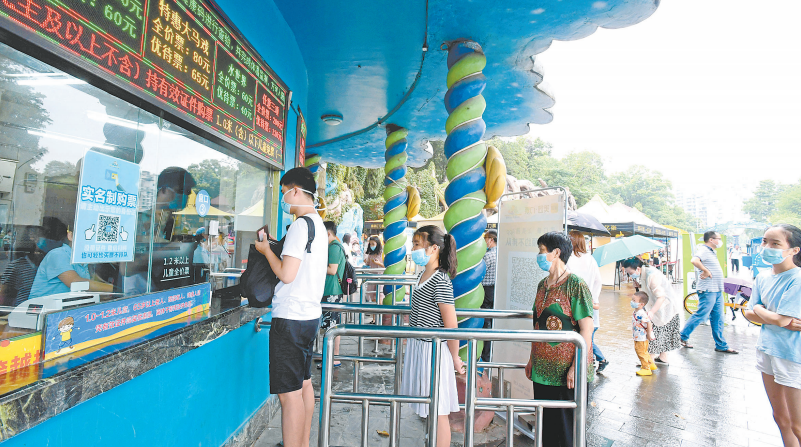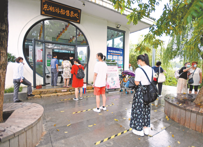 7月26日,东湖风景区内游船售票处、观光车售票处等售票窗口,游人自觉戴口罩保持距离排队购票。