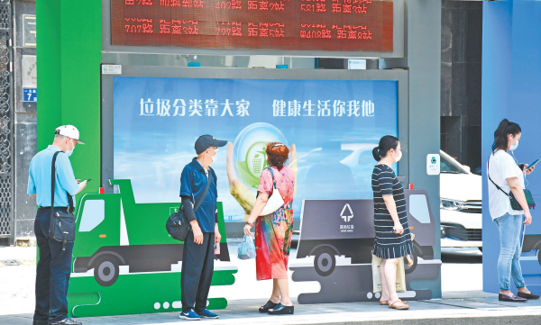 汉口胜利街一元路公交车站装饰主题是“垃圾分类”,让市民在等公交的同时了解垃圾分类的目的与重要性。