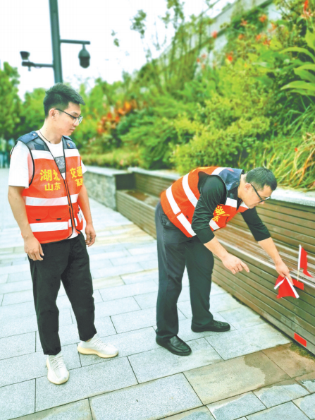26日14时许,青年党员樊树李、秦笃志身穿红马甲,手拿小红旗,从三阳路闸口出发,沿着沿江大道人行道巡堤查险。走到一半,他们看到堤段与人行道交界的缝隙处,有少量渗水,立即插上小红旗,提醒值守人员持续保持关注。