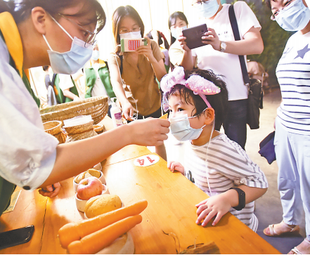 小游客闻大熊猫的食物。 记者 许魏巍 通讯员 陈立云 摄