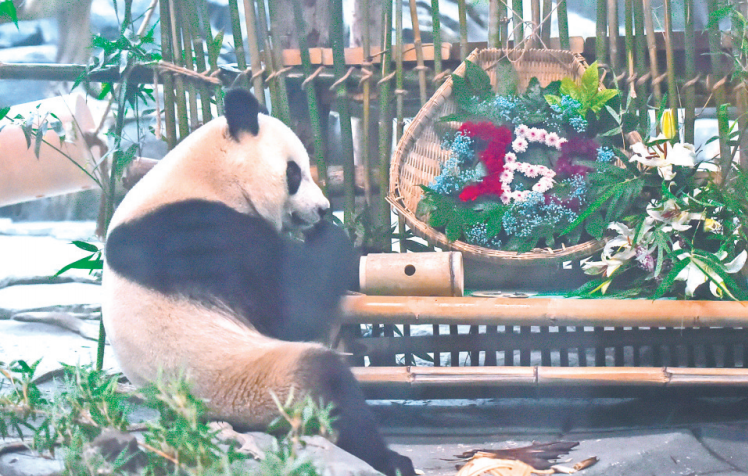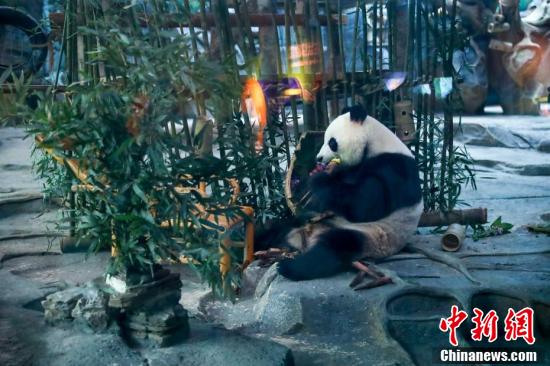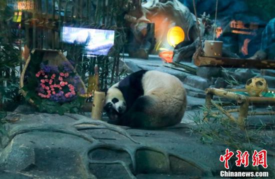 一走进大熊猫馆,就看到头顶天花板用云朵和彩色气球做成蓝天白云的造型;在大熊猫姐妹花各自的内展厅,栖架台前都设置了一面用若干根竹子拼接在一起筑成的背景墙,墙体中间用鲜花做了一个“365”的彩色扎景,此时春俏和胖妞都在各自的内场房间大快朵颐。“胖妞增重40斤,春俏增重10斤。”大熊猫奶爸汪志勇为市民展示姐妹花日常的食物:“主食是楠竹,竹笋是零食,竹笋每半个月从四川空运到武汉,它们一天要吃5斤。除此之外,还有胡萝卜和窝窝头等,一日7餐,每天不重样。”