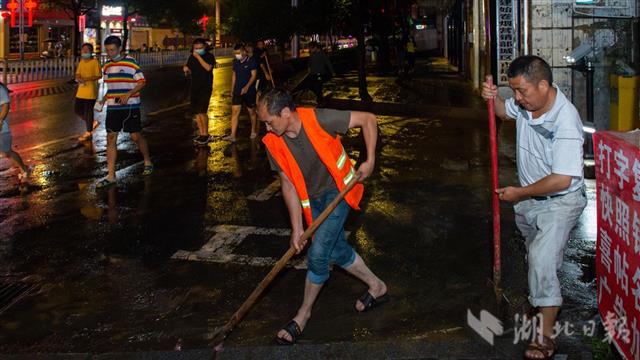 7月26日22时,建始县业州大道,环卫工人正在清洗路面。当日,建始县普降大到暴雨、局部特大暴雨,城区及长梁镇、龙坪镇、茅田乡集镇低洼地带内涝严重,环卫工人连夜清扫,使城市环境尽快恢复洁净。(湖北日报全媒记者 蔡俊 摄)