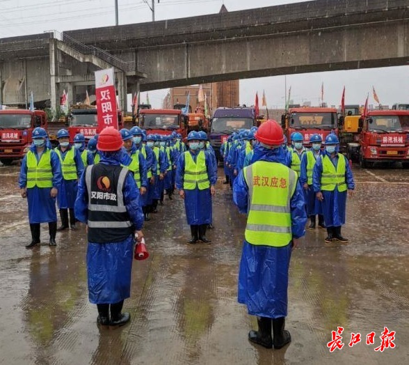 10分钟内集结完毕,车辆打开双闪一起发动,有序发车前往百步亭基地进行1小时防汛物料装载作业。每个小组由1台挖掘机和2辆后八轮自卸车组成,挖掘机挖物料,后八轮自卸车负责装运。