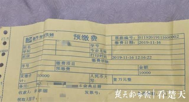 丁女士的儿子今年18岁,高中就读于武汉一所学校。去年11月份,为了让儿子学习更多的技能,丁女士帮他报名了湖北新东方烹饪学校的金典总厨专业。听说预缴学费可以享受优惠,丁女士当时缴纳了1万元。学校的谢老师称,如果孩子参加高考考取了更好的学校,可以随时退掉这笔学费。