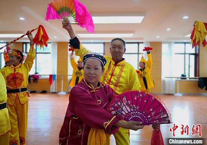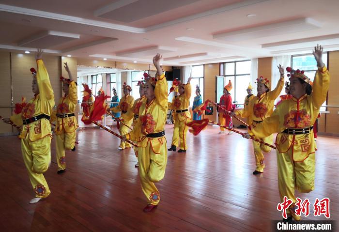 欢快的节奏,不断变换的队形,甘肃省嘉峪关20多位退休人员,将当地非物质文化遗产地蹦子与霸王鞭结合,创编出新的舞蹈《欢天喜地庆丰收》,并搬上舞台。 刘玉桃 摄