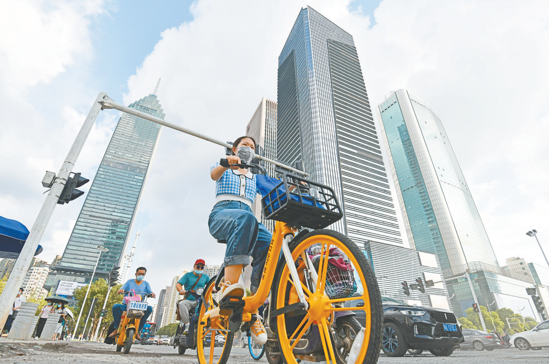 7月28日下午6时,在汉口建设大道上,下班行人骑行街头。