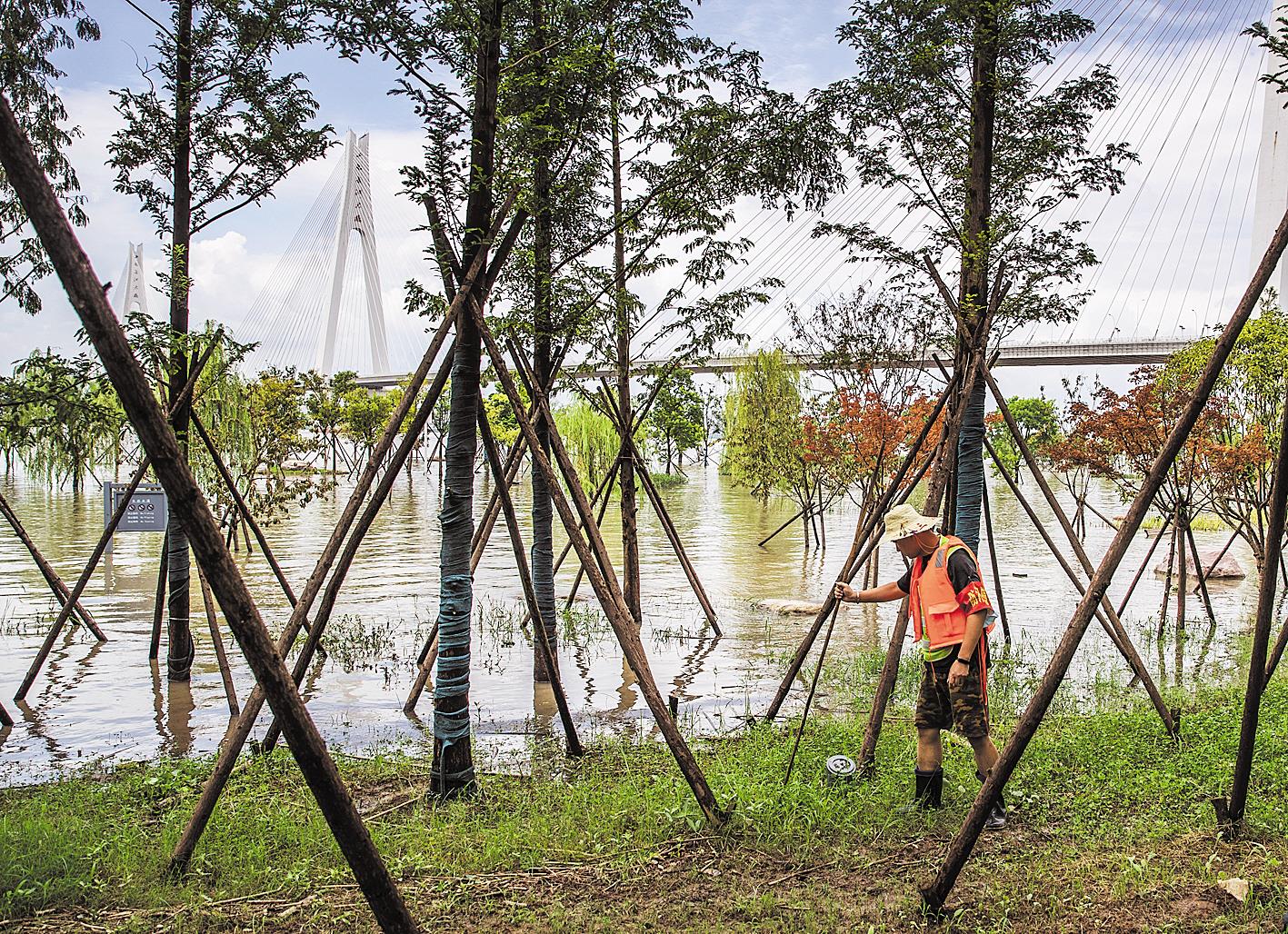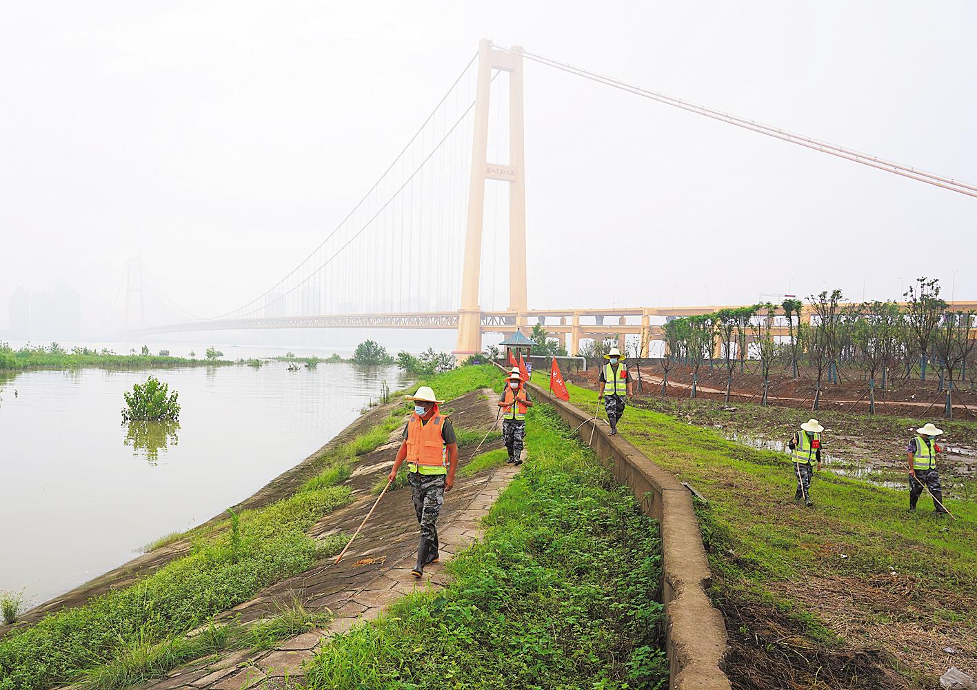 7月2日以来,武汉市洪山区洪山街道防汛人员一直在杨泗港大桥下的长江大堤武金堤段巡堤查险。(湖北日报全媒记者 周立新 蔡俊 摄)