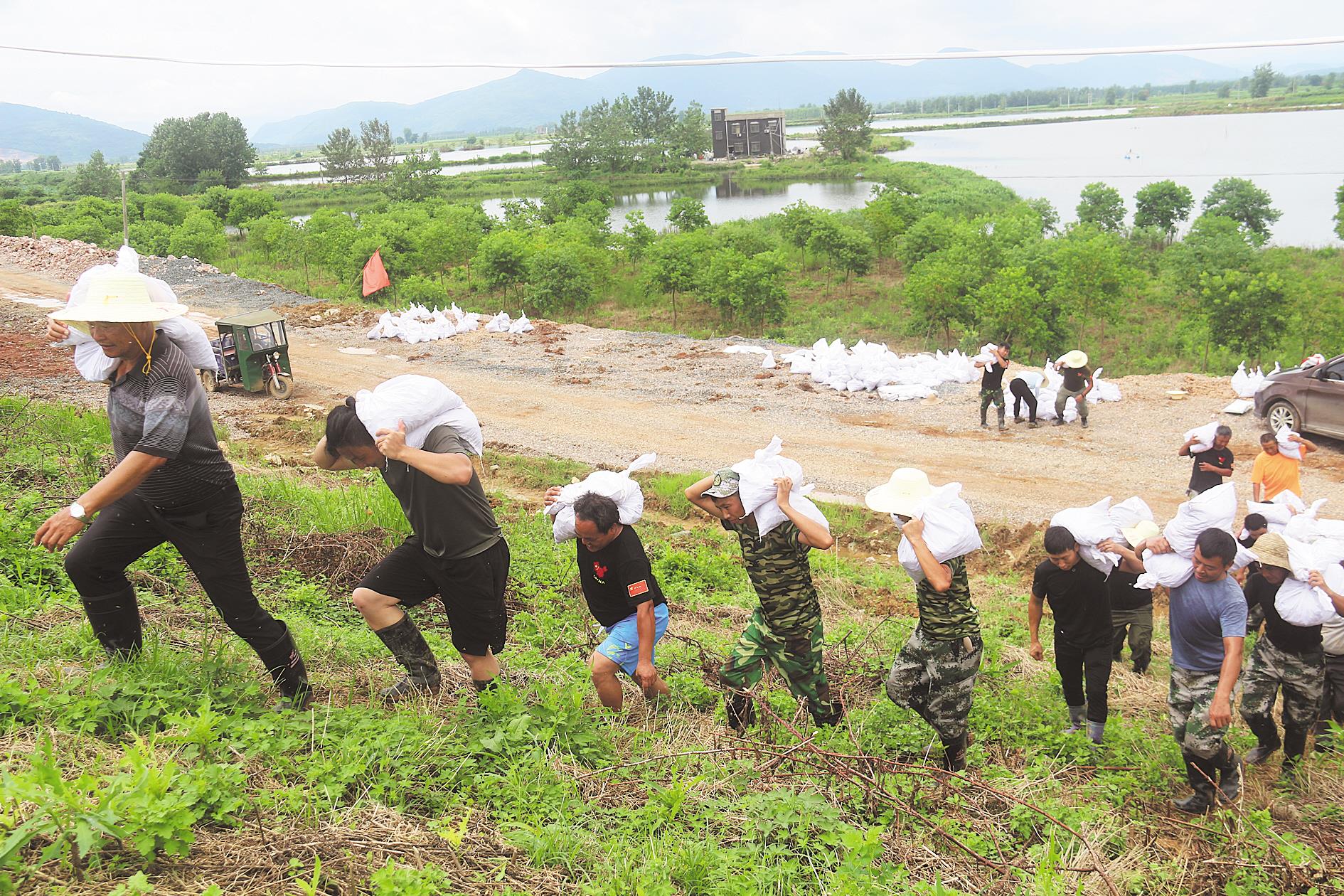 7月28日,阳新县富河下游网湖隔堤陆续出现多处浪坎,兴国镇宝塔村防汛突击队搬运物料,铺设防水雨布,防止浪坎面积扩散。(视界网 江显平 摄)