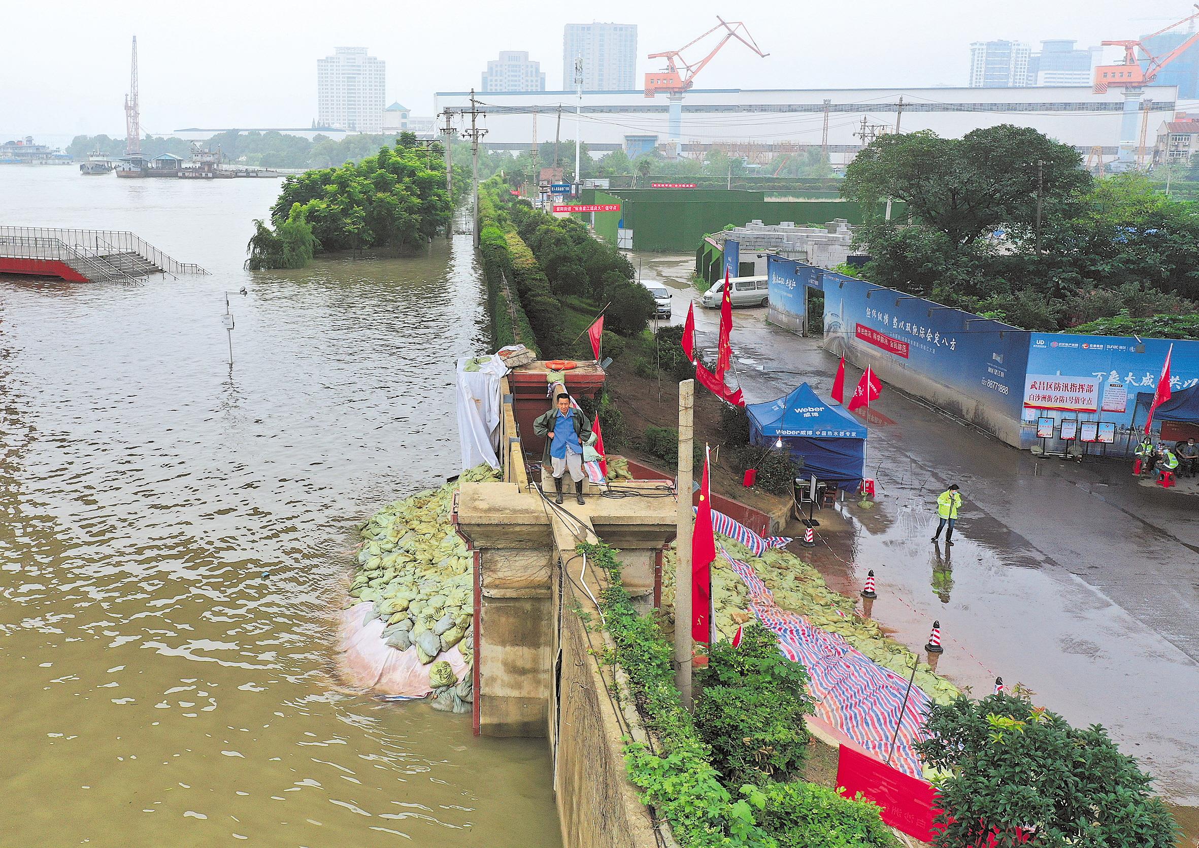 连日来,武昌白沙洲街道防汛人员坚守在长江干堤鹦鹉洲大桥闸口。(湖北日报全媒记者 周立新 蔡俊 摄)