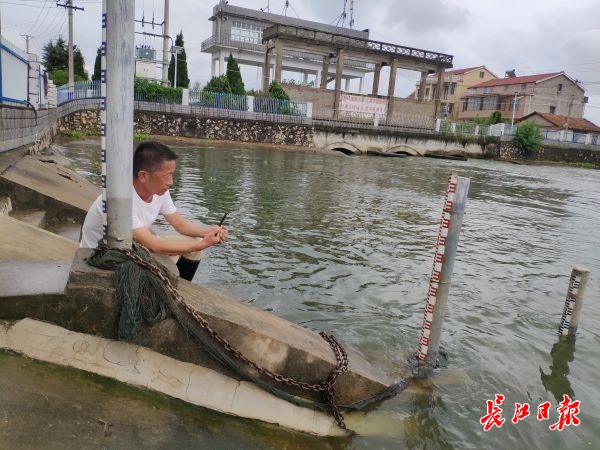 长江网7月29日讯 27日下午,天空中飘起小雨,江夏区法泗街新河村党支部书记曾文沿着金水河大堤巡查,关注着水位变化。新河村位于金水河与斧头湖的交界处,负责巡查1.5公里的大堤,在堤上有新河村的3个书记坐镇,分别是村支书曾文、村里的老书记曾祥勇和驻村第一书记朱时进。他们分别发挥自己的优势,守卫大堤保护家园。