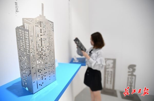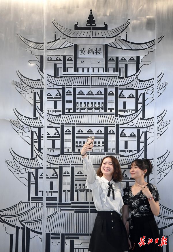 市民在华工科技智能制造产业园的华工激光博物馆《黄鹤楼》前留影。