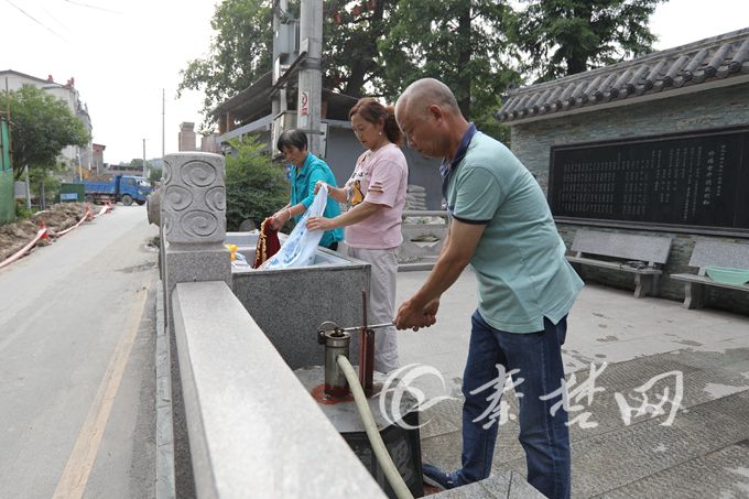 说起古井,放马坪的居民们都知道。近日,在他们的带领下,记者见到了这口“古董”。只见古井旁边修有围栏,井口经过修缮,用石头砌了起来。从井口往下看,水质清澈。居民们为水井装上了简易抽水装置,只要按压几下抽水手柄,井水就会从水管里流出来。水井旁有一个清洗池,居民们正在用井水洗衣服。