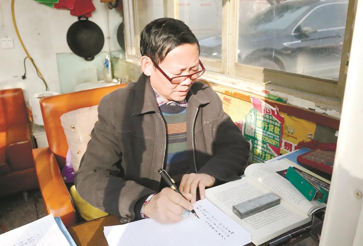 老唐说,他15年前来到民政局当门卫后,就开始用钢笔手抄毛选、邓选等文献,因为常关注时政新闻,觉得手抄能够记忆深刻领悟透彻。到后来形成了习惯,他经常利用午休和下班后的时间,按照自己制定的学习规划,每天花至少4个小时来誊抄重要法律法规、领导讲话,边抄边学。
