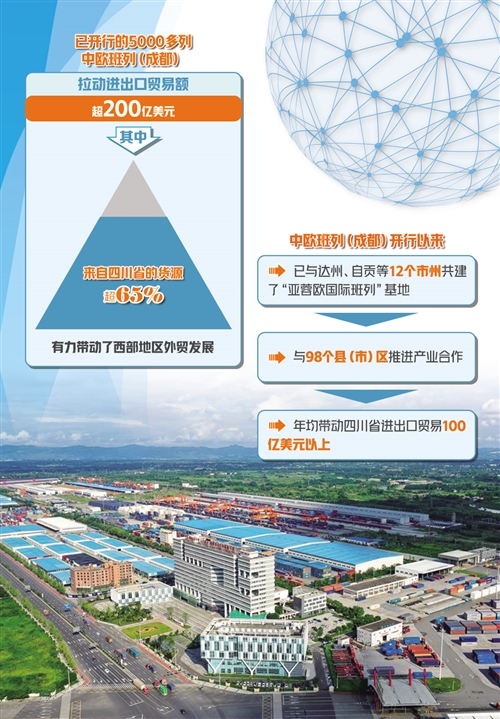 开行7年来,中欧班列(成都)已与达州、自贡等12个市州共建了“亚蓉欧国际班列”基地,与98个县(市)区推进产业合作,年均带动四川省进出口贸易100亿美元以上。