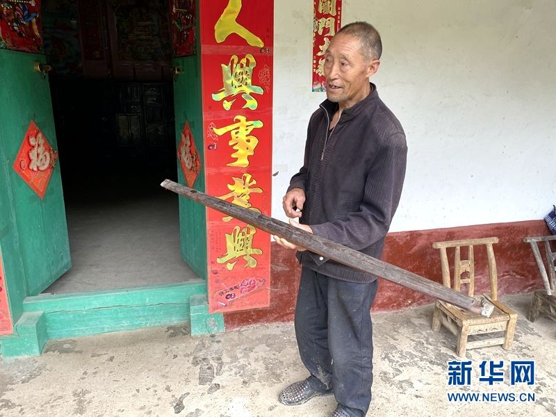 张远政老人展示曾经用于挑水的扁担。 新华网 赵梦琪摄